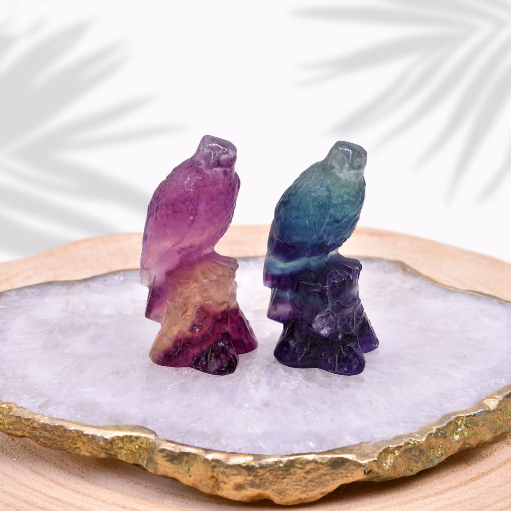 This hand-carved totem captures the eagle in a noble stance, crafted from AAA-grade Multicolour Fluorite — a crystal known for enhancing mental clarity, focus, and energetic protection. The rainbow hues of violet, rose, yellow, and blue reflect the multidimensional nature of spiritual vision, reminding us of the beauty of seeing life from many perspectives.