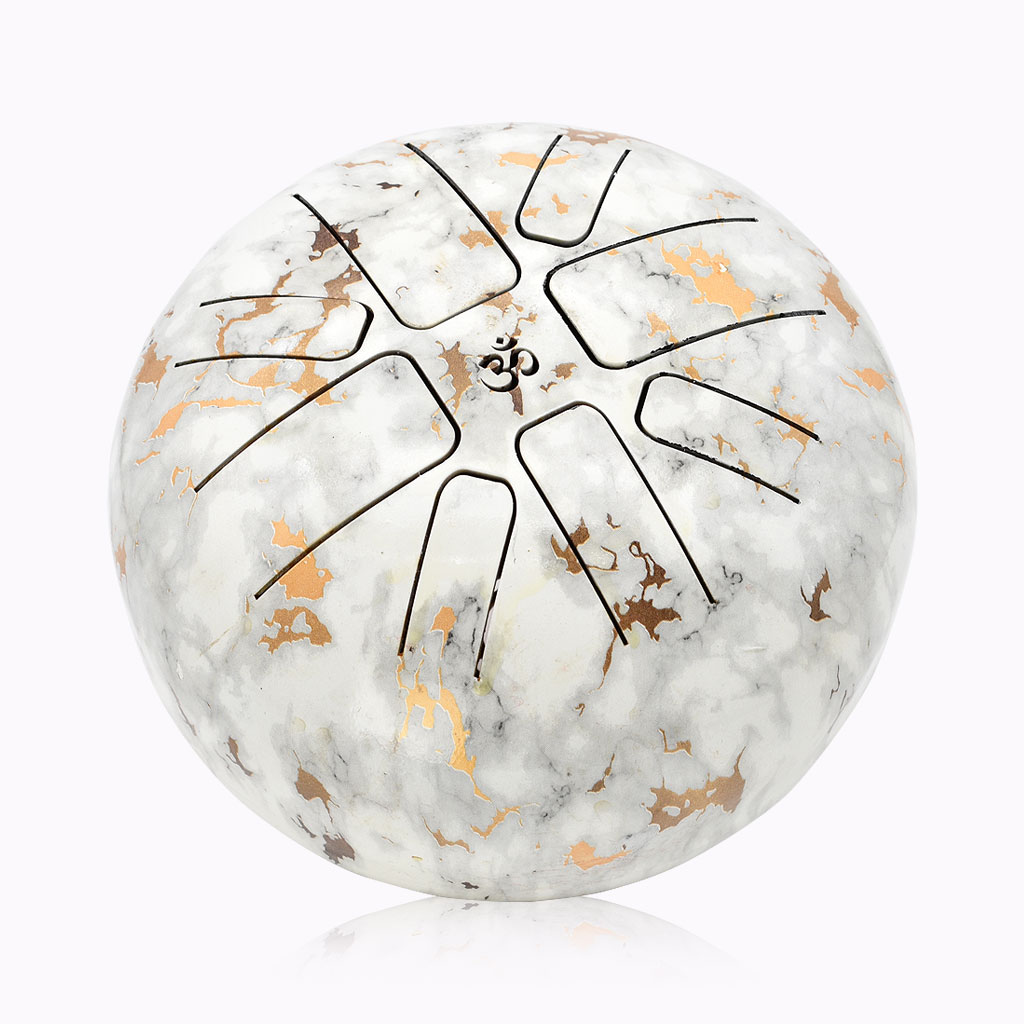 This Happy Drum features a refined white and gold marble-style finish, offering a calm and elegant aesthetic. The Om symbol at the centre represents balance, presence, and the universal vibration of sound.