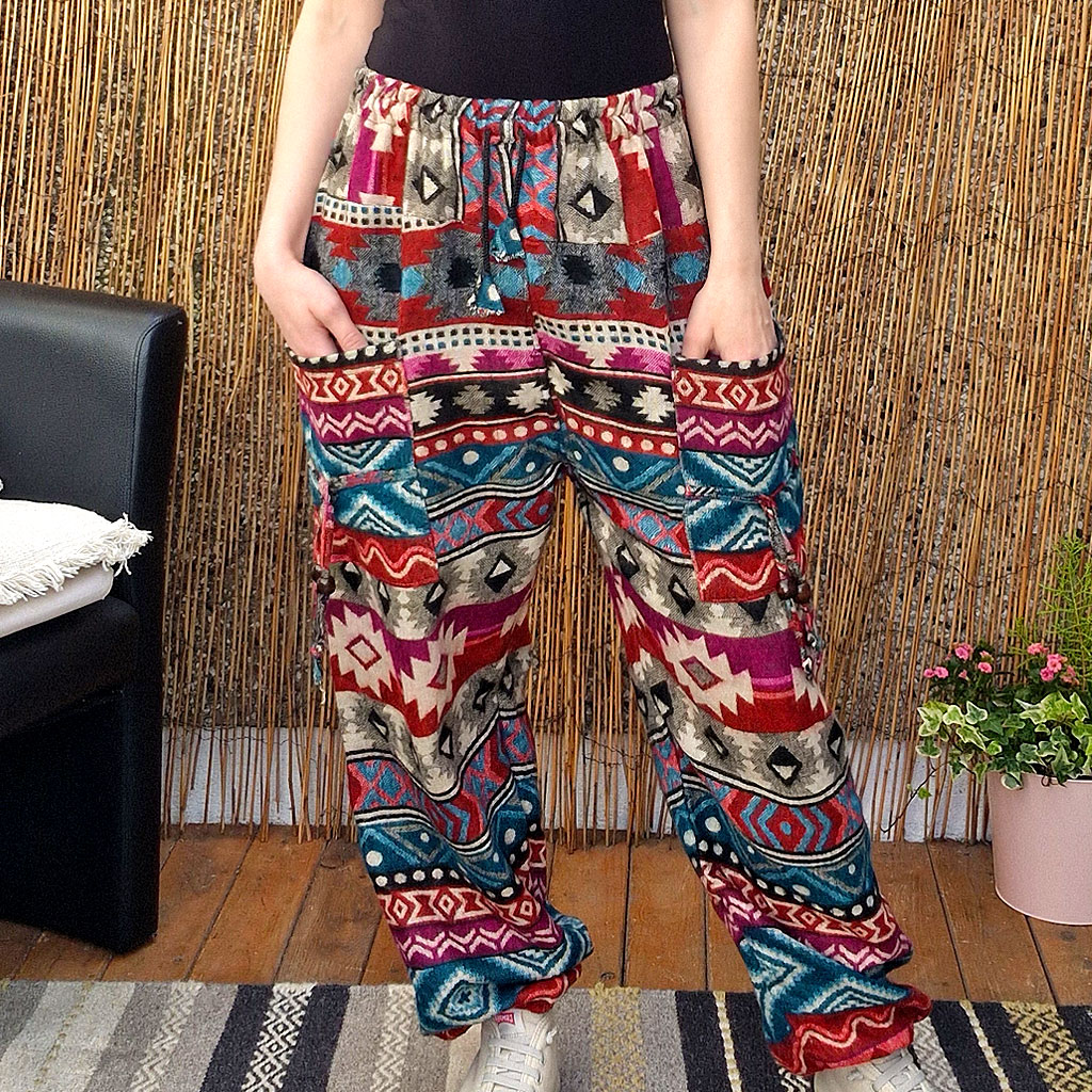 Classic tribal trousers with a mix of grey, red and blue tones, offering a timeless and comfortable style.